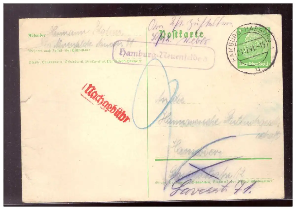 Dt- Reich (021410) Ganzsache Hindenburg P225, Nachgebühr gelaufen Hamburg am 23.12.1941