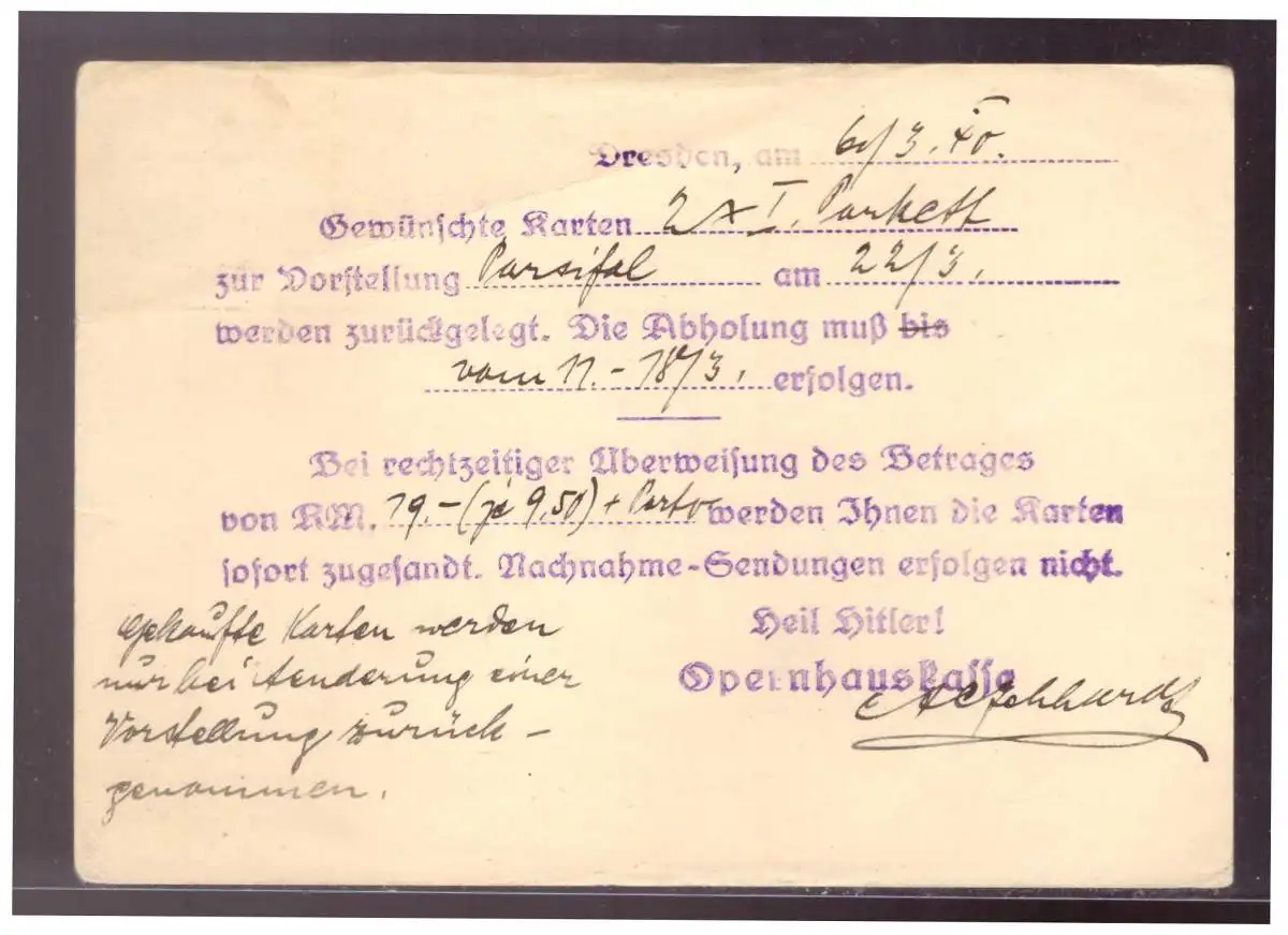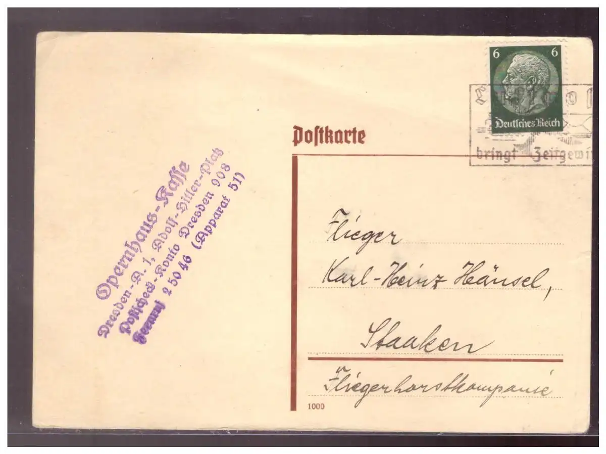 Dt- Reich (022013) Postkarte Kartenbestellung Opernhaus Dresden, gelaufen 6.3.1940