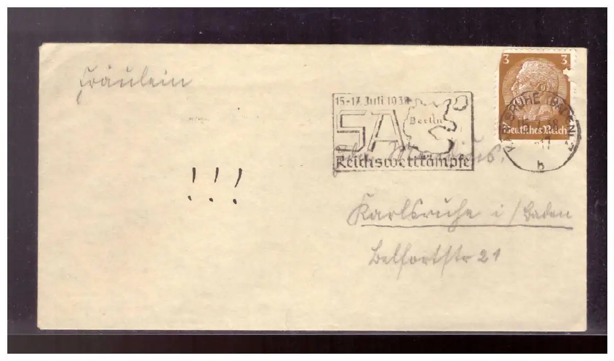 Dt- Reich (022097) Brief, gelaufen Karlsruhe mit Werbestempel SA Reichswettkämpfe Berlin 15.7.1938