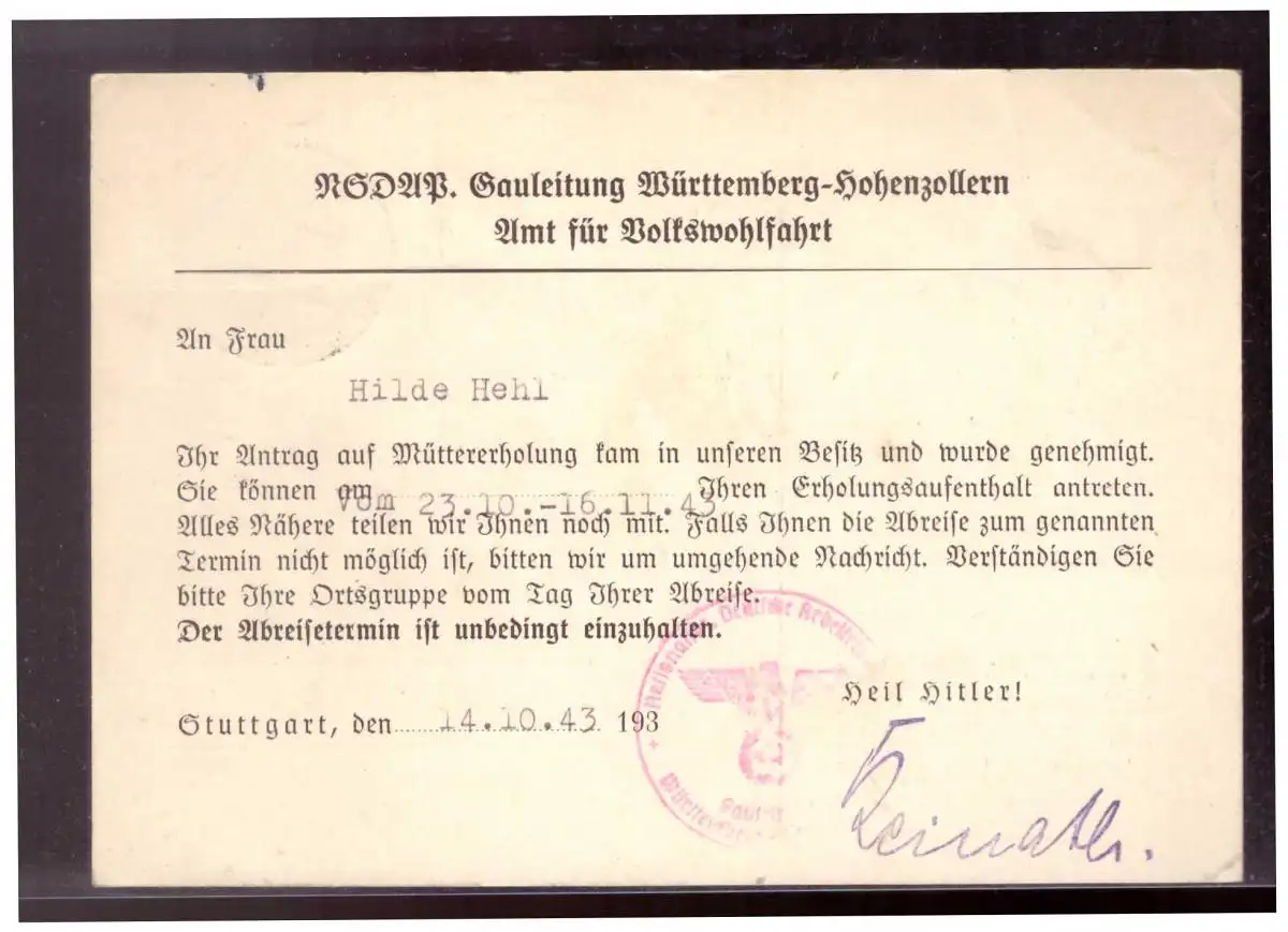 Dt- Reich (022131) Postkarte Müttererholung NSDAP Gauleitung Württemberg- Hohenzollern, Bescheid Erholungsaufenthalt