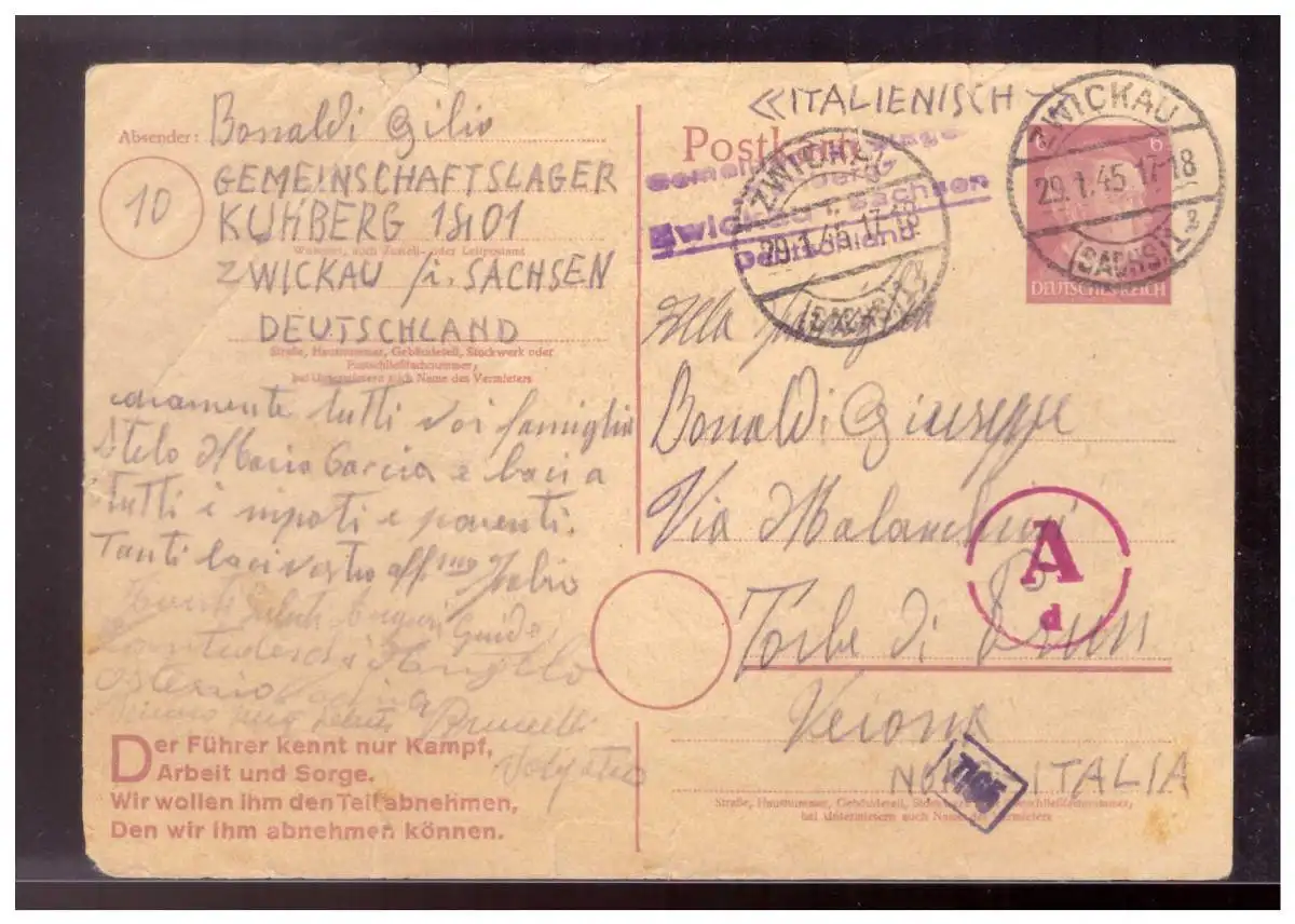 Dt- Reich (022207) Fremdarbeiter Ganzsache P312/09 Lager Kuhberg (Zwickau) gelaufen nach Torbe di Prun Verona 29.1.1945