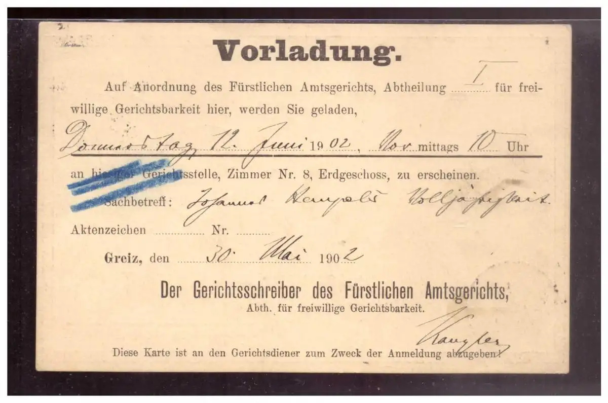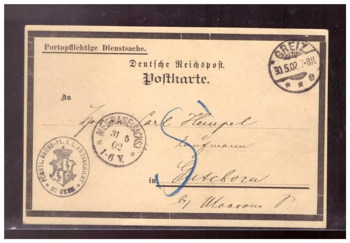 Dt- Reich (022366) Postkarte Portopflichtige Dienstsache mit Nachporto, Vorladung Fürstlichen Amtsgericht, gel Greiz