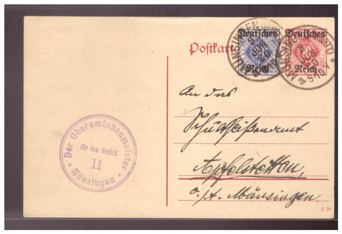 Dt- Reich (022374) Ganzsache DP11/ 01 mit Zusatzfrankatur, gelaufen Münsingen