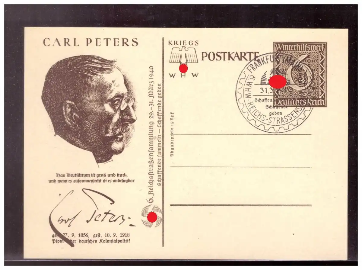DT- Reich (0022447) Ganzsach P286/ 06 Carl Peters mit KDF Zudruck mit blanco Sonderstempel Frankfrut 31.3.1940