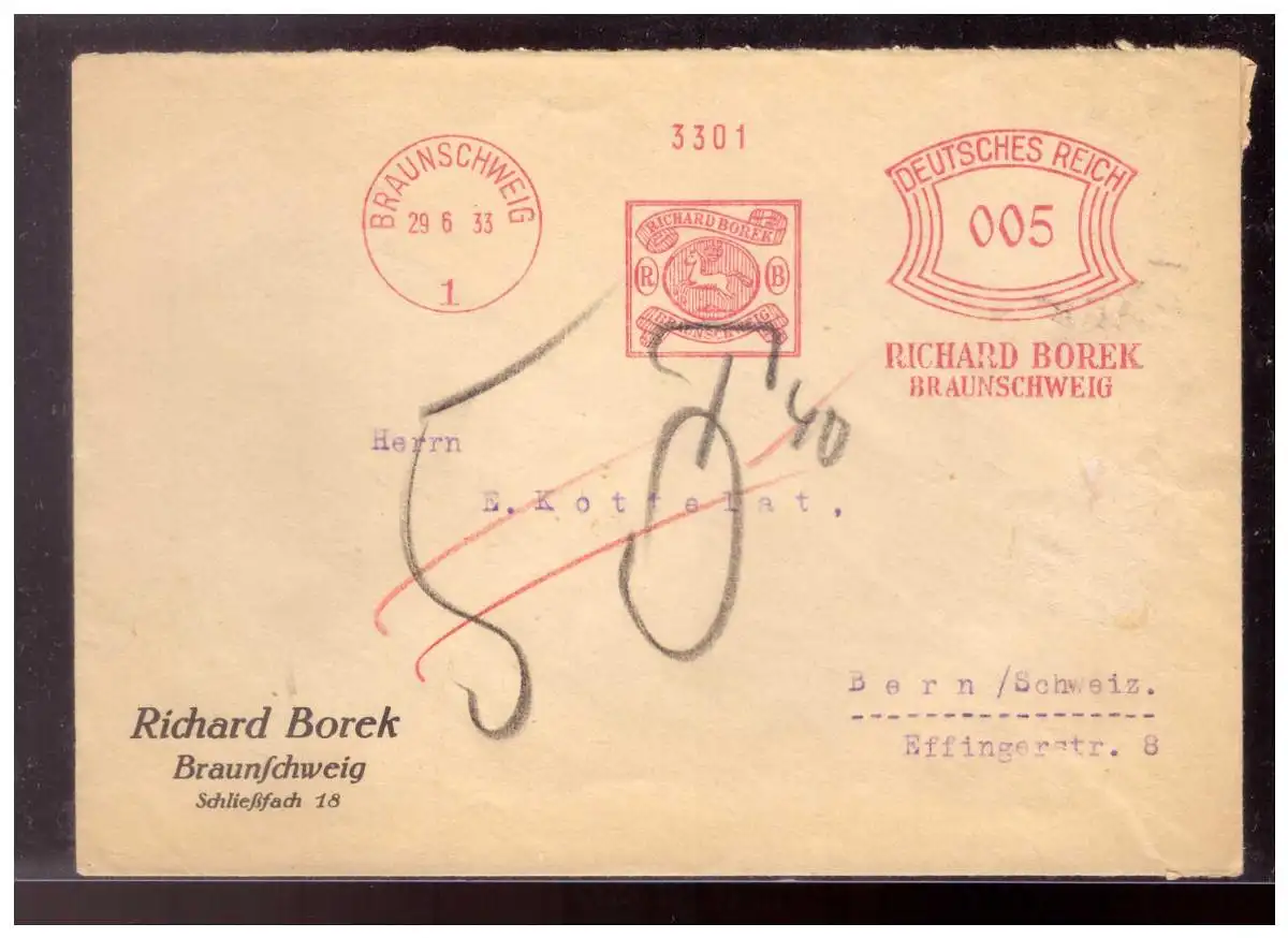 Dt- Reich (022564) Brief mit Freistempler Richard Borek Briefmarken mit Nachporto, gelaufen nach Bern am 29.6.1933
