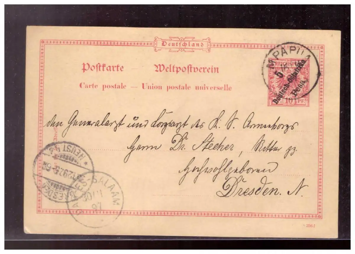 Kolonien (022575) Ostafrika Ganzsache P10 Stempel Mpapua, Dar-Es-Salam, gelaufen nach Dresden