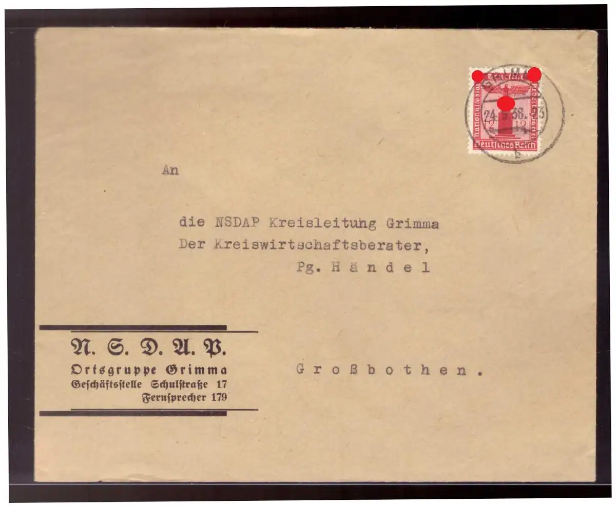 Dt- Reich (022608) Vorgedruckter Umschlag NSDAP Ortsgruppe Grimma gelaufen Grimma 24.5.1938 nach Grossbothen
