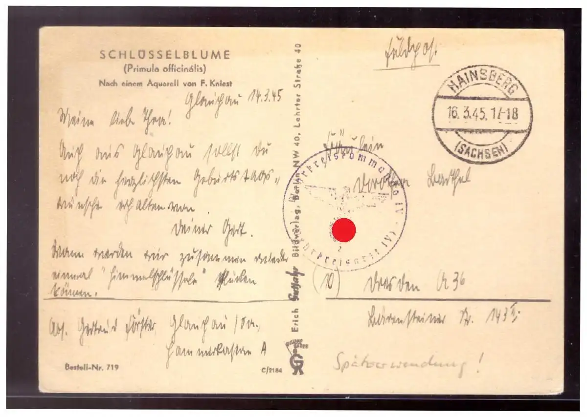 Dt- Reich (022653) Postkarte Schlüsselblume, Spätverwendung 16.3.1945 gelaufen Heinsberg mit Feldpost