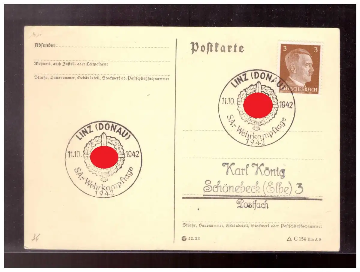 Dt-Reich (022671) Propagandastempel auf Postkarte SA- Wehrkampftage 1942, Linz am 11.10.1942