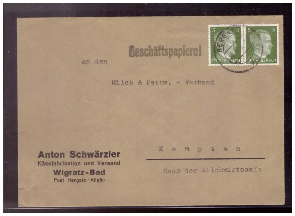 Dt-Reich (022676) Brief mit privaten Firmenzudruck Geschäftspapiere Käserei A.Schwärzler, Wigratz- Bad, gelaufen
