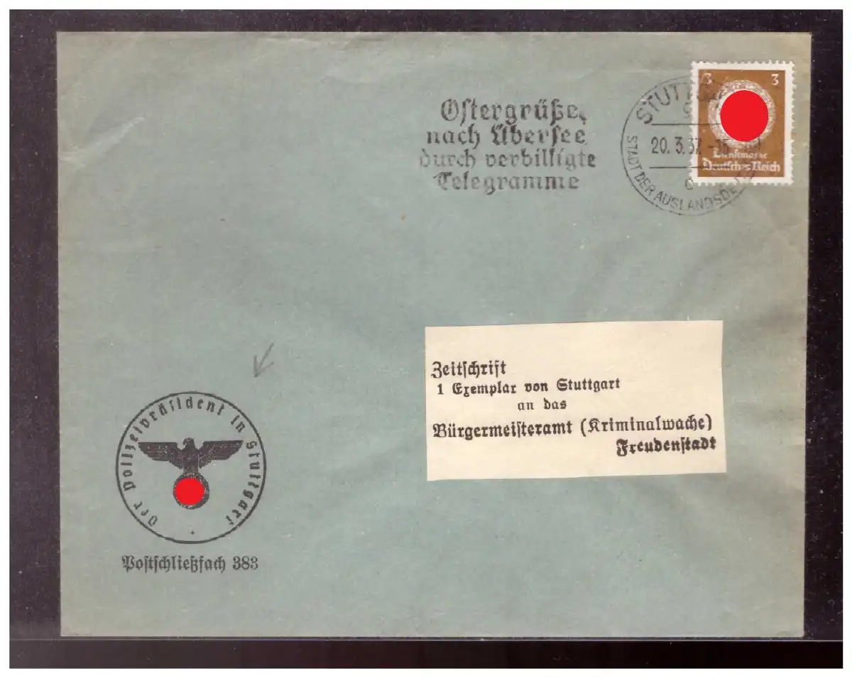 Dt- Reich (022774) Vorgedruckter Dienstbrief Der Polizeipräsident in Stuttgart gelaufen mit Mash- Stempel Stuttgart 20.