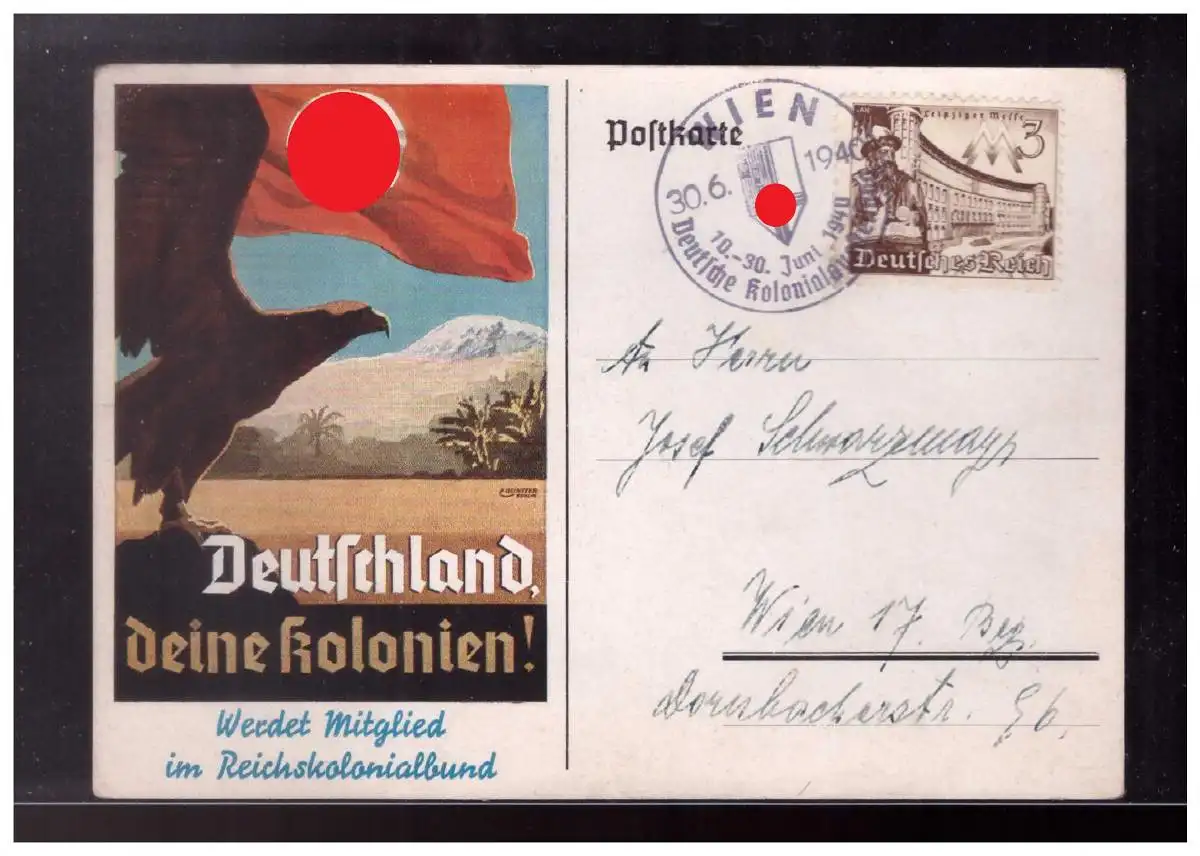 Dt- Reich (022908) Propaganda Postkarte Deutschland deine Kolonien, gelaufen Wien 30.6.1940