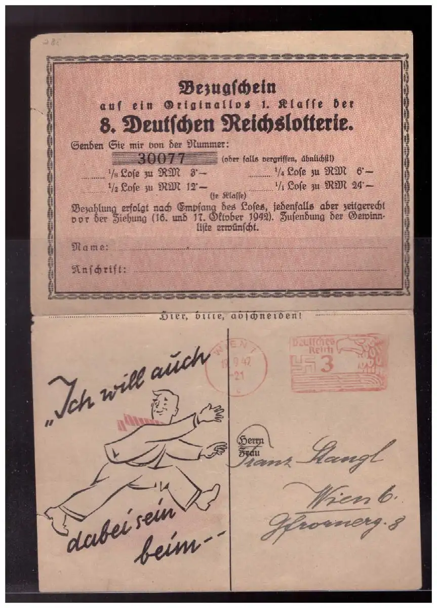 Dt- Reich (022915) Klappantwortkarte, Ich will auch dabei sein beim: Bezugsschein 8. Deutsche Reichslotterie, Antwort