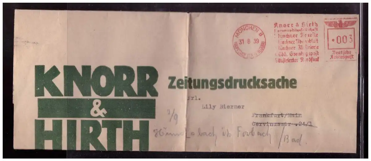Dt- Reich (022916) Streifband Zeitungsdrucksache Knorr & HirthMünchen Gelaufen mit Freistempel München 31.8.1939