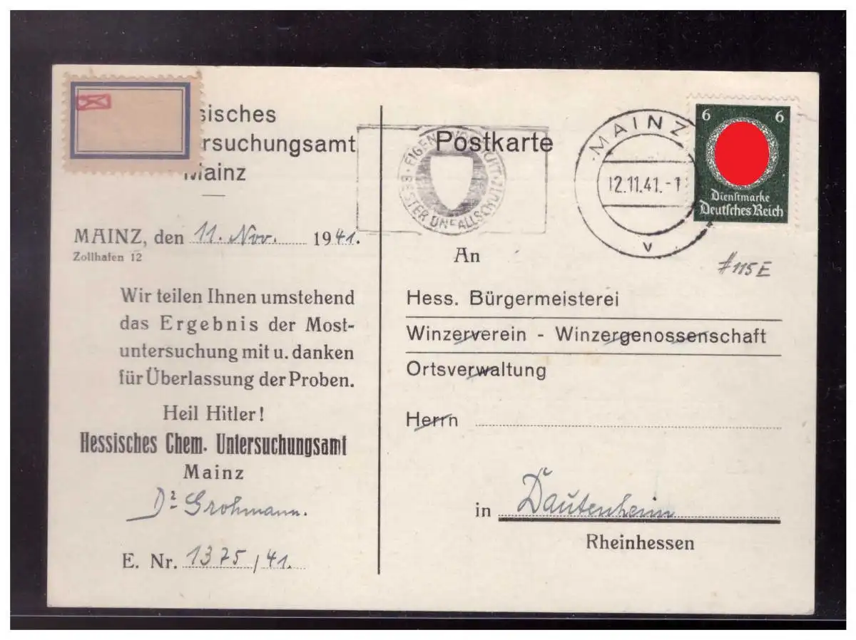 Dt- Reich (022977) Dienstpostkarte vorgedruckt Hessisches Untersuchungsamt Mainz, Ergebniss der Mostproben, gelaufen 12.