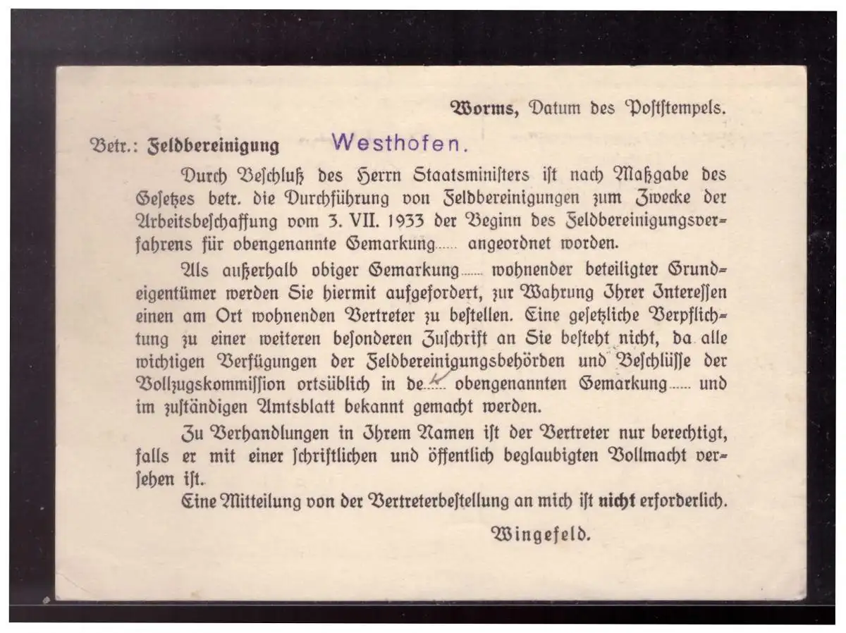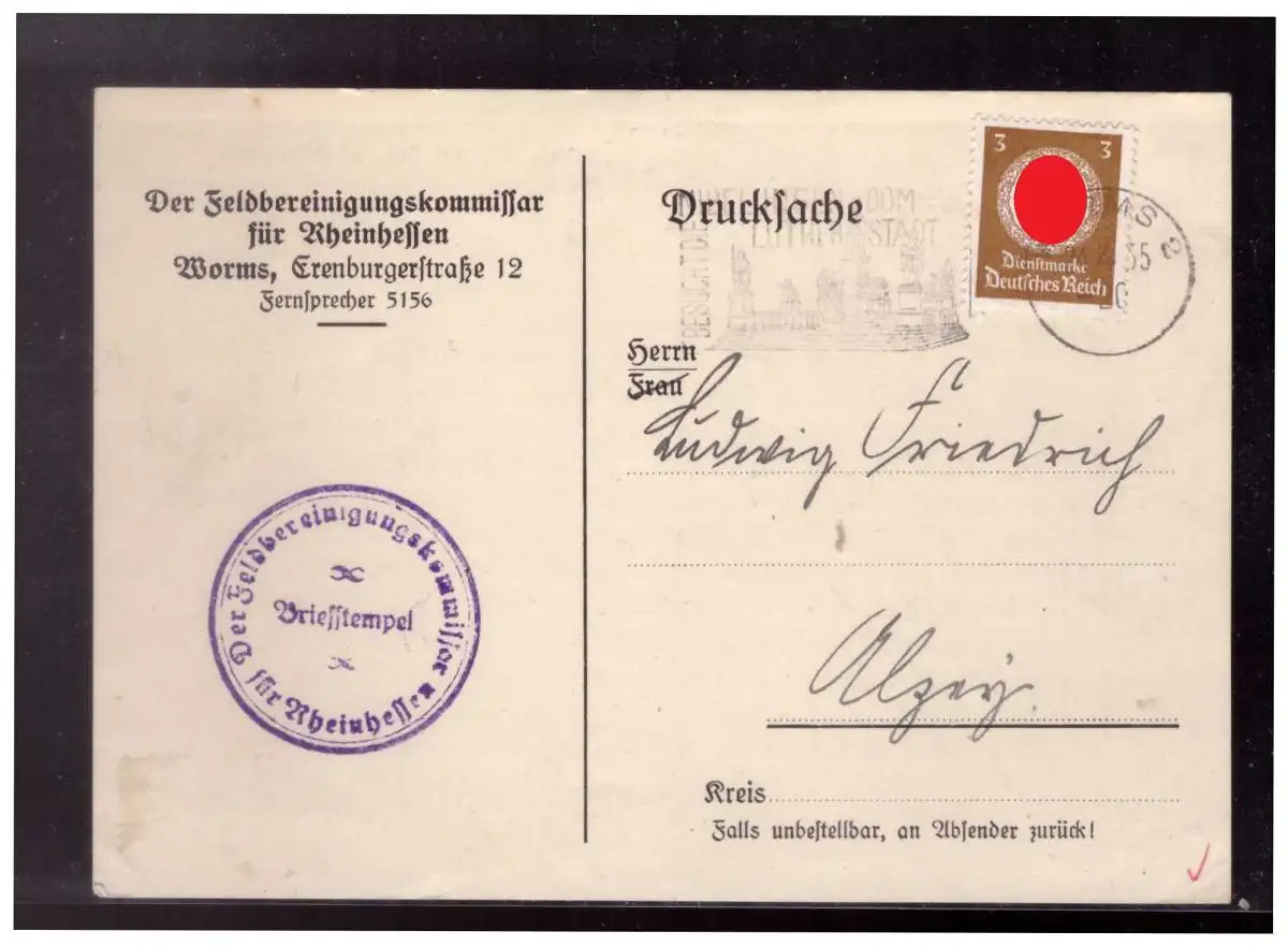 Dt- Reich (022978) Dienstpostkarte vorgedruckt Flugbereinigungskommissar in Rheinhessen mit Dienststempel gelaufen Worms