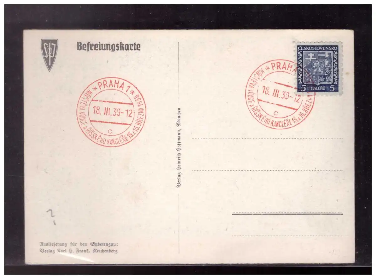 Böhmen und Mähren (022988) Befreiungskarte ähnlich Ganzsache P275, Hoffmannkarte, blanco mit SST Prag 18.3.1939