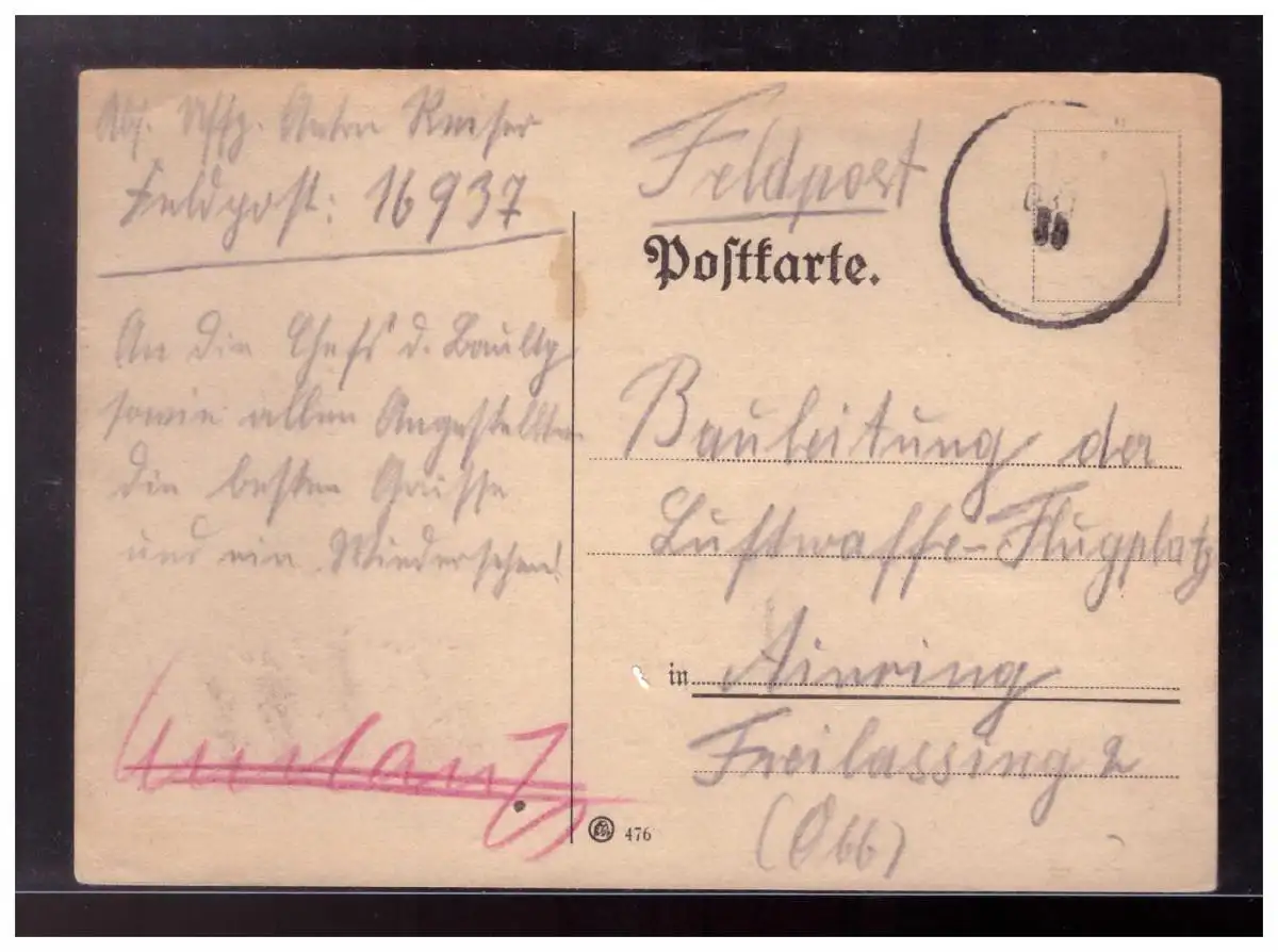 Dt- Reich (023170) Feldpostpostkarte mit Tarnstempel gelaufen an Bauleitung Flugplatz Freilassing gel. 1939