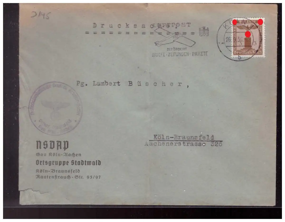 Dt.- Reich (023197) Propaganda Vorgedruckter Brief NSDAP Gebiet Köln- Aachern, Ortsgruppe Stadtwald gel Köln 8/1938