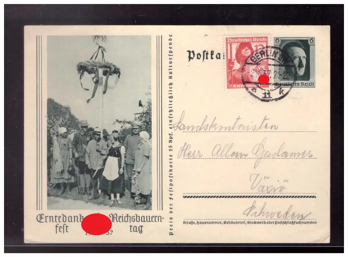 Dt- Reich (023928) Ganzsache P265 mit Zusatzfrankatur, gelaufen nach Schweden von Berlin 1937