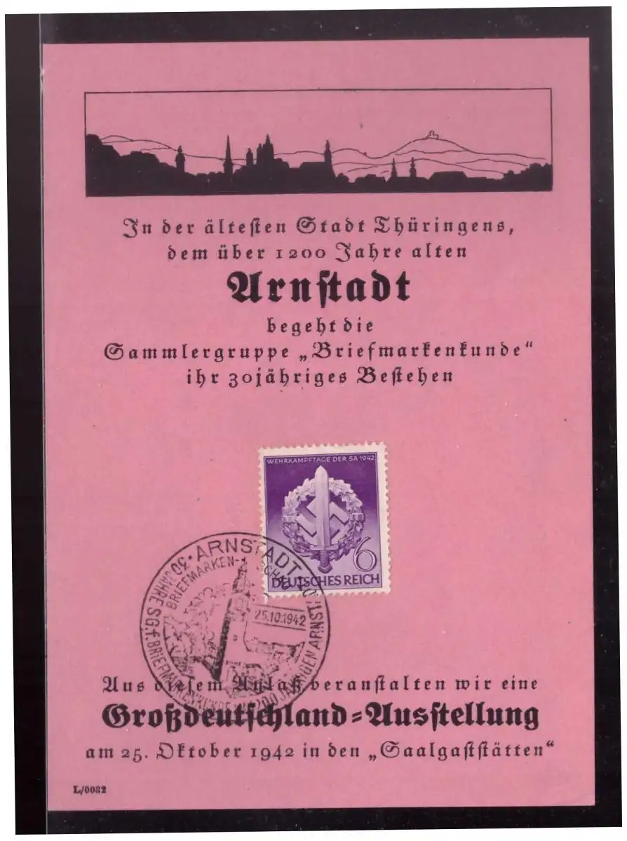 Dt- Reich (024156) Propaganda Gedenkblatt Arnstadt älteste Stadt Thüringens, mit SST 25.10.1942