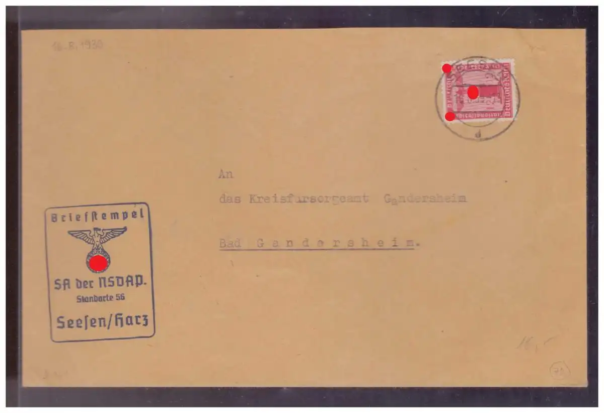 Dt- Reich (024626) Propaganda Dienstbrief SA der NSDAP Standarte 56 Seesen/ Harz, gelaufen 1939