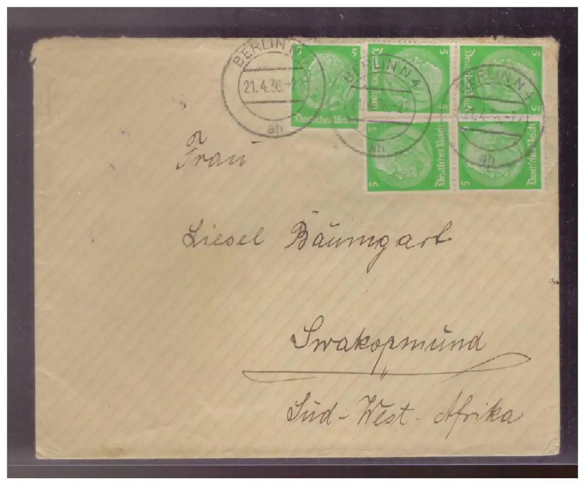 Dt- Reich (024667) Brief 5 Pf Hindenburg 5 x als Mef gel.nach Süd- Afrika mit TST Berlin 21.4.1936