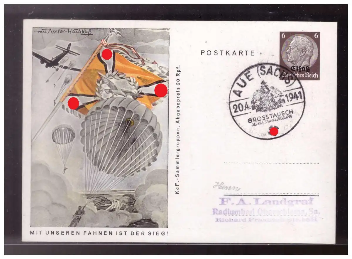 Dt-Reich (024684) Propaganda Ganzsache Elsaß P5/ 01 Fallschirmjäger, mit gest. Adresse RS Ankunftstempel!!