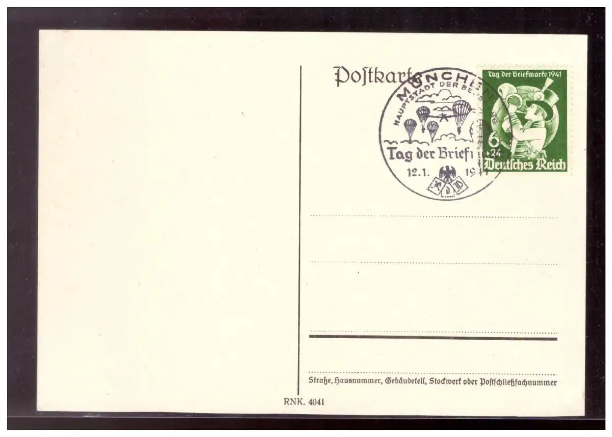 DT-Reich (020943) Postkarte zum Tag der Briefmarke mit MNR 762 als FDC mit SST München am 12.1.1941
