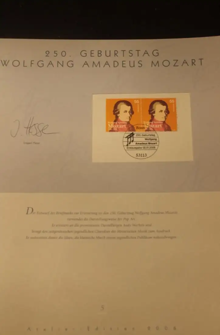 Aufwändig gestalter und hergestellter Bogen aus Kunstdruckkarton mit Leinenstruktur im Format etwas größer als DIN A4. Auf dem Doppelbogen Marke oder Block mit Ersttagsstempel, sowie die nicht angenommenen Konkurenzentwürfe. Unter der Marke befindet sich die Unterschrift (Faksimile) der Entwerfes. Diese Blätter wurden jewils nur in einer sehr kleinen Auflage von der Deutsche Post an Abonnenten abgegeben und sind somit viel seltener als ähnliche Produkte, wie die Ersttags-Sammelblätter oder privat hergestellten Künstler-Ersttagsblätter. Auf Seite 4 bzw. 6 (nicht abgebildet) eine ausführliche Beschreibung zum Anlaß.