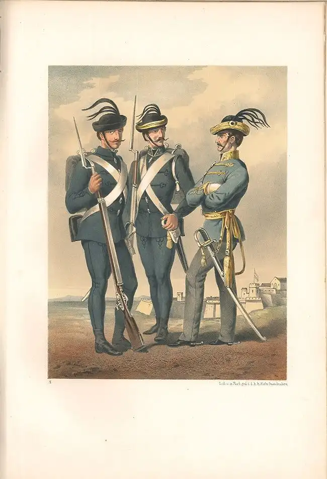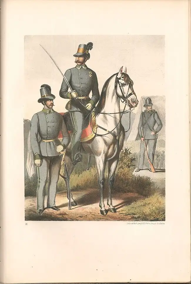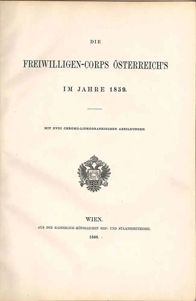 Bemerkungen: De Ridder, Catalogue de Costumes Militaires. Autriche-Hongrie, 1928, 26 - Die prachtvollen Uniform-Tafeln zeigen die im Jahre 1850 gebrauchten Uniformen der versch. Ländern der Monarchie: Nieder-Oesterreich (Wien), Ober-Oesterreich, Steiermark, Krain und Küstenland, Böhmen, Mähren, Ost-Galizien, West-Galizien, Ungarn, Serb. Wojwodschaft und Temeser Banat sowie Croatien und Slavonien. - Im Armeebefehl Kaiser Franz Josephs I. vom 25. 1. 1857 wurden im Zusammenhang mit dem Organisations-Statut der k .k. Armee auch die für die Aufstellung von Freiwilligen-Corps geltenden Normen festgelegt.