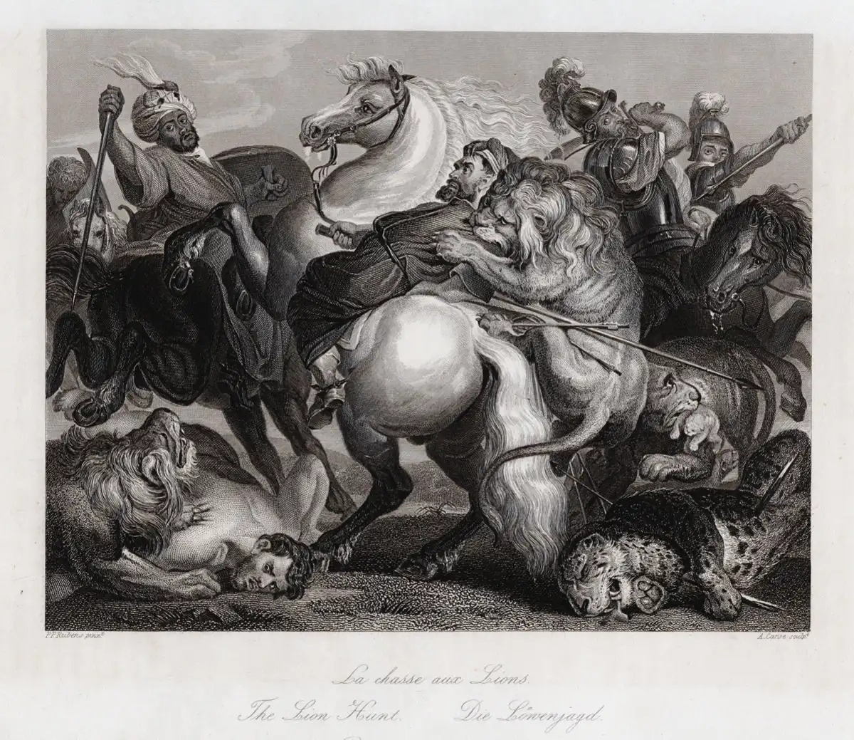 Die Löwenjagd. Originaler Stahlstich n. Rubens um 1850