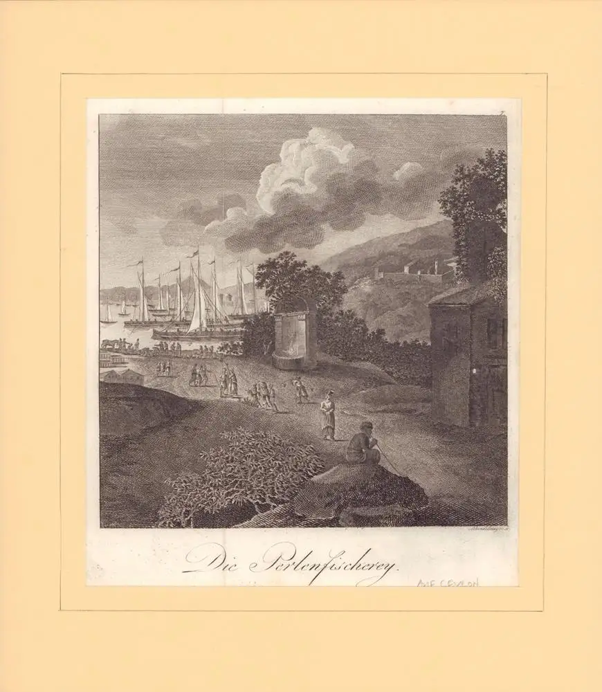 Die Perlenfischerey [auf Ceylon]. Kupferstich von Schindelmayer