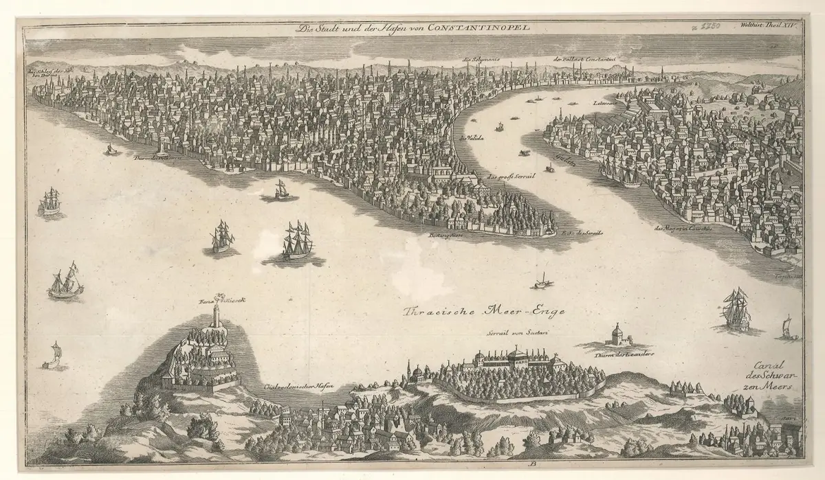 Bemerkungen: Ansicht der Stadt Constantinopel (Istanbul) aus der Vogelperspektive. Aus: Siegmund Jacob Baumgartens "Allgemeinen Weltgeschichte", Bd. XIV.