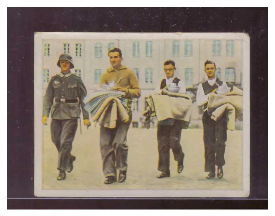 Freie Beschreibung: Dt-Reich (009342) Sammelbild Die deutsche Wehrmacht, Haus Bergmann, Bild 14, Empfang von Bettwäsche und Eßgeschirr