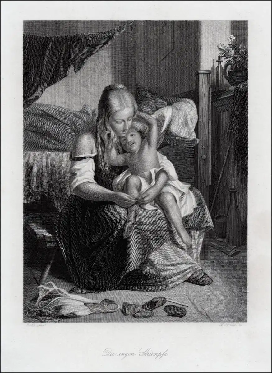 Die engen Strümpfe. Originaler Stahlstich; von French um 1850