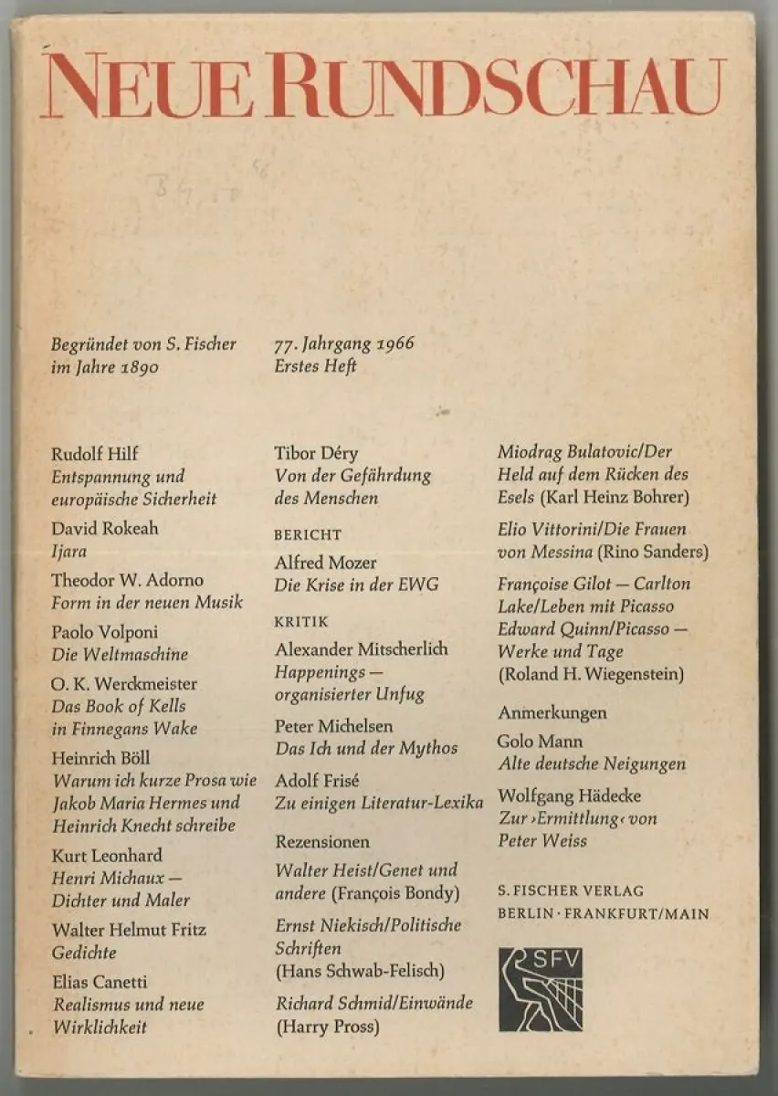 Bemerkungen: Enthält unter anderem Beiträge von: Rud. Hilf, Th. W. Adorno (Form in der neuen Musik), H. Böll, E. Canetti (Realismus und neue Wirklichkeit), A. Mitscherlich, Fr. Gilot, Golo Mann (Alte deutsche Neigungen) u. a.