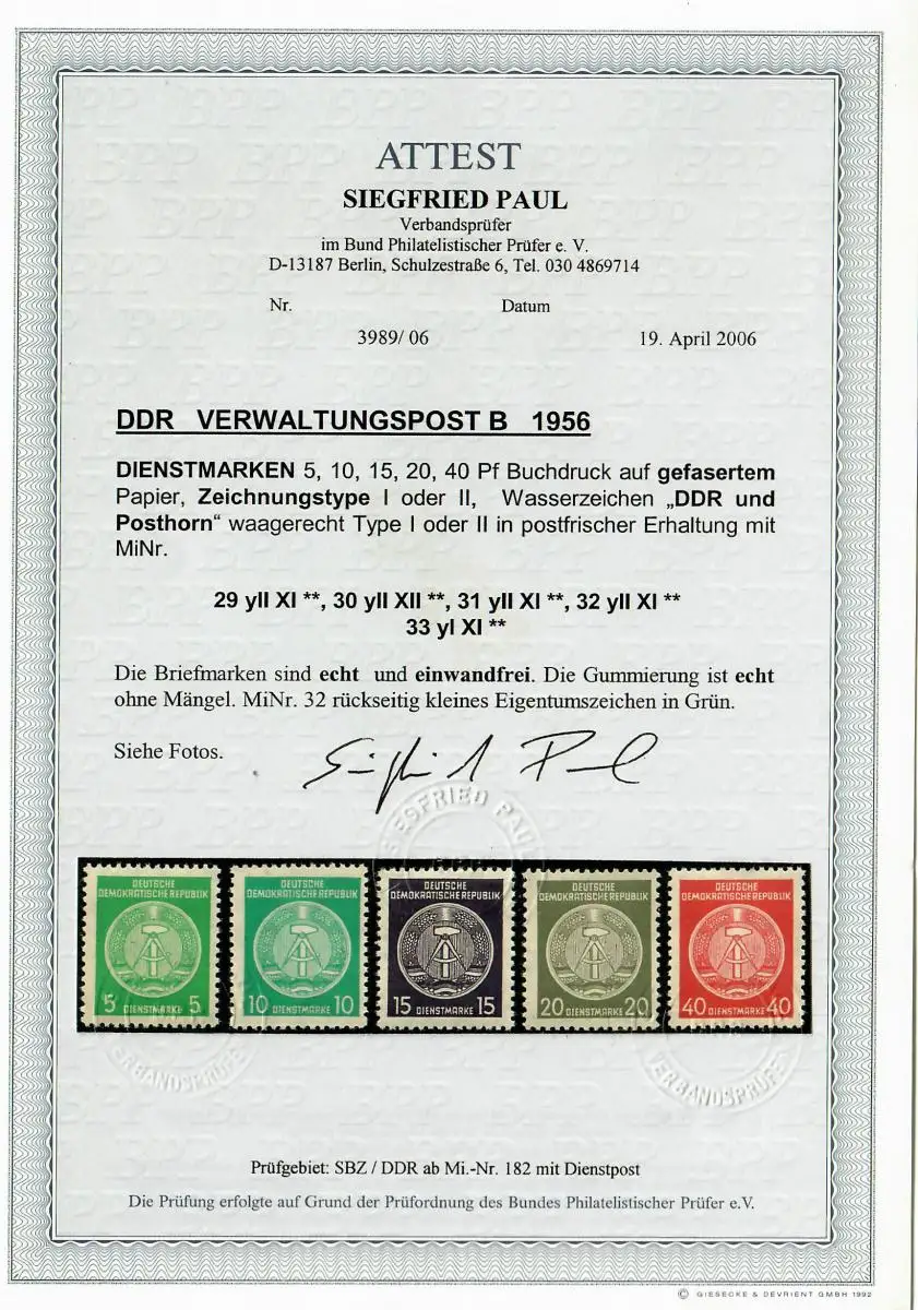 Dienst B: MiNr. 29 yII XI, 30 yII XII, 31 yII XI, 32 yII XI, 33 yI XI BPP Attest