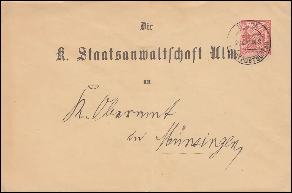 von der Staatsanwaltschaft Ulm an das Oberamt in Münsingen, Umschlag mittig senkrecht leicht angefaltet