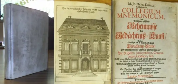 Erste Ausgabe des Lehrbuchs des Mnemotechnikers Johann Heinrich Döbel in deutscher und lateinischer Sprache. Er lehrte in Rostock , Leipzig und Hamburg. // Buchinhalt: I. Die Gedächtniß-Kunst an sich selbst - nebst einer neu inventirten Gedächtniß-Stube, zugleich mit einem Unterricht derselben / II. Ein Collegium Mnemonicum mit X. gewissen Lectionibus / III. Die vindicirte Gedächtniß-Kunst / IV. Die Connexion oder Verbindung der Wörter, Zahlen, Sententien, Chronologie / V. Der Zahl-Buchstaben Teutsches Lexicon / VI. Doe grosse Mathematische Zahl des Diametri gegen den Umkreis gerechnet; wie sie durch die Kunst in gar kurzer Zeit zu behalten / VII. Die Connexion der berühmtesten Universitäten in ganz Europa / VIII. Die Continuation Chronologiae Bunoniane / IX. S. Biblia Versibus Mnemonicis Alphabethicis tradita / XII. Eine Probe von denen nach der Gedächtniß-Kunst eingerichteten Nahmen de Ketzer / XIII. Die Probe der Cryptographie oder geheimen Schreib-Kunst / XIV. Eine Nachricht Artem Lullianam und Extemporalitatem in Predigten betreffend / XV. Gebrauch der Gedächtniß-Kunst so wohl zu Welt- als Geistlichen Reden oder Predigten mit 4 Exempeln erkläret.