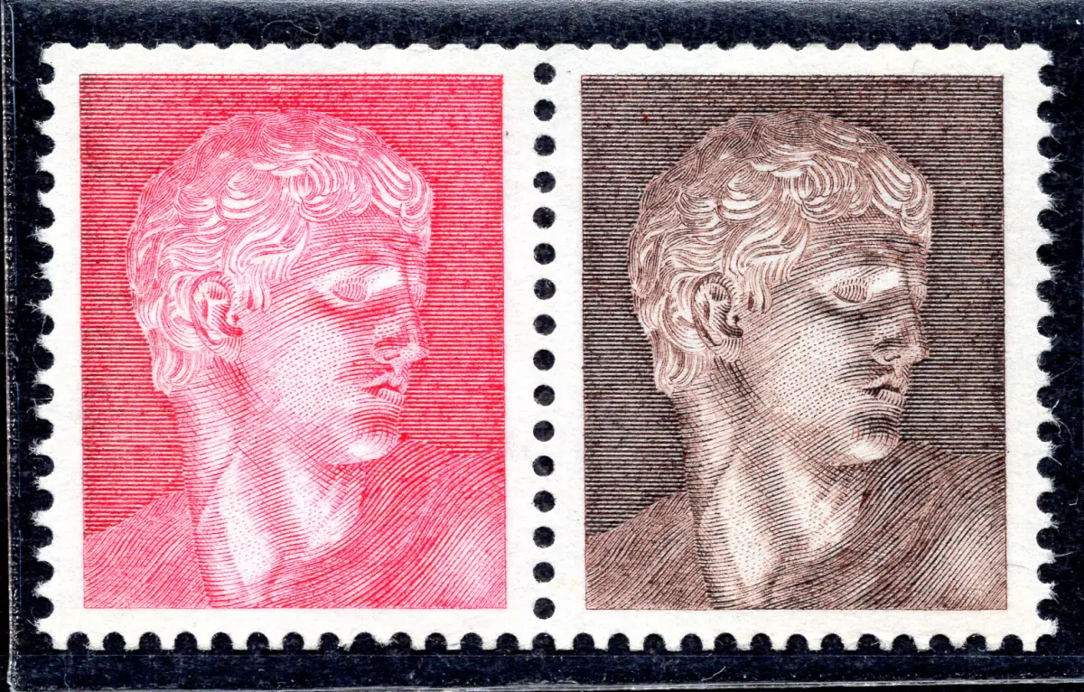 Donatello-Büste Verteilerautomatenprobe rot und braun Vollgummi - Donatello-Büste - Briefmarkenprobe für Verteilerautomaten - Paar mit wechselnden Farben rot + braun Kammverzahnung (Kat. Sass. spec. Nr. P 94) - Ungewöhnlich - Kat. euro 300 Cod. 684/8