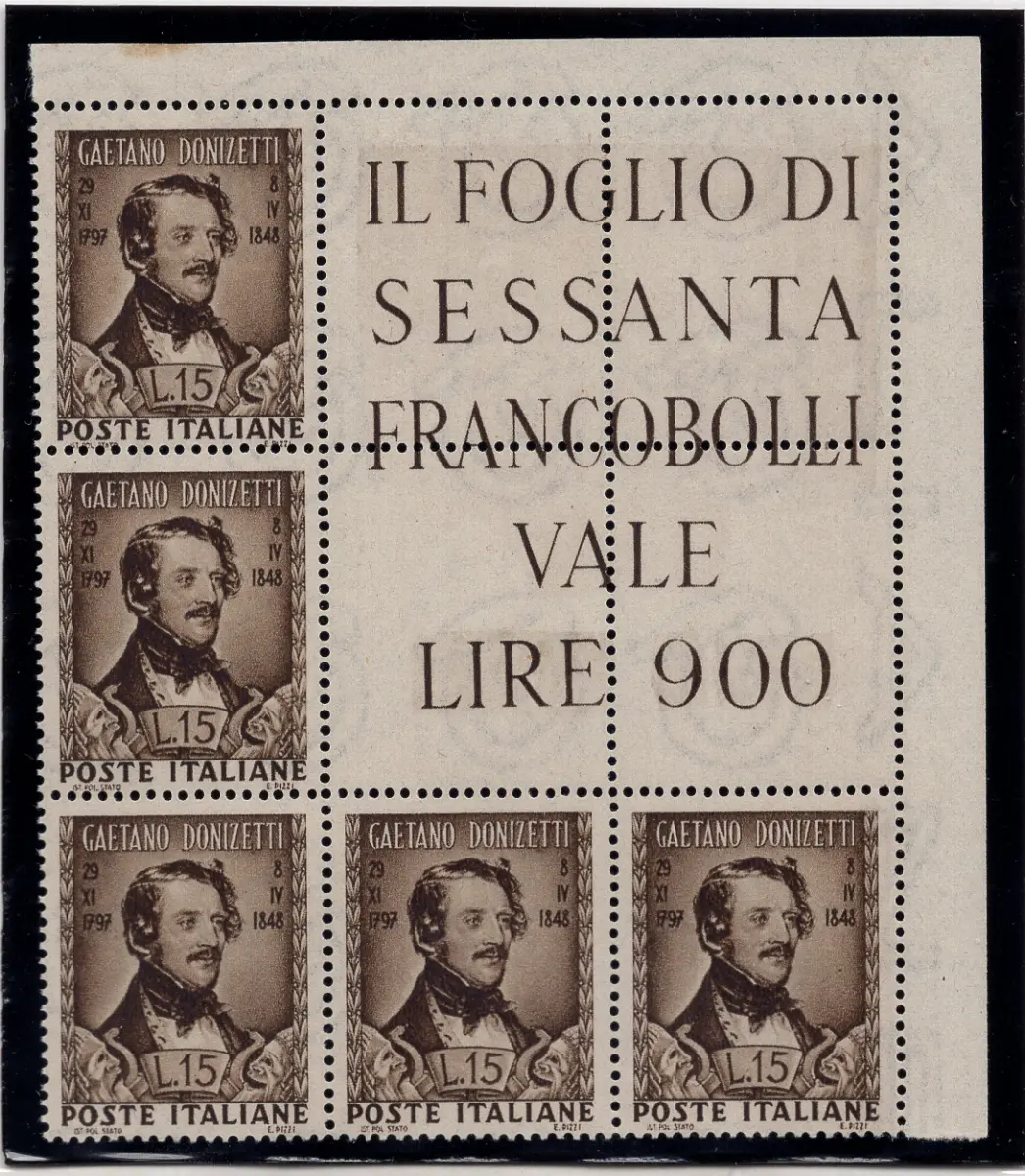 MNH - Vollgummi - Donizzetti Nr. 593 Eckblock von fünf Exemplaren (Katalog Coll.it Nr. 1) perfekt, gut zentriert mit Vollgummi - Kat. euro 50 Cod. 2751/WEB