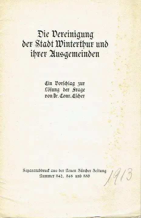 Dr. Conr. Escher: Die Vereinigung der Stadt Winterthur und ihrer Ausgemeinden Ein Vorschlag zur Lösung der Frage.