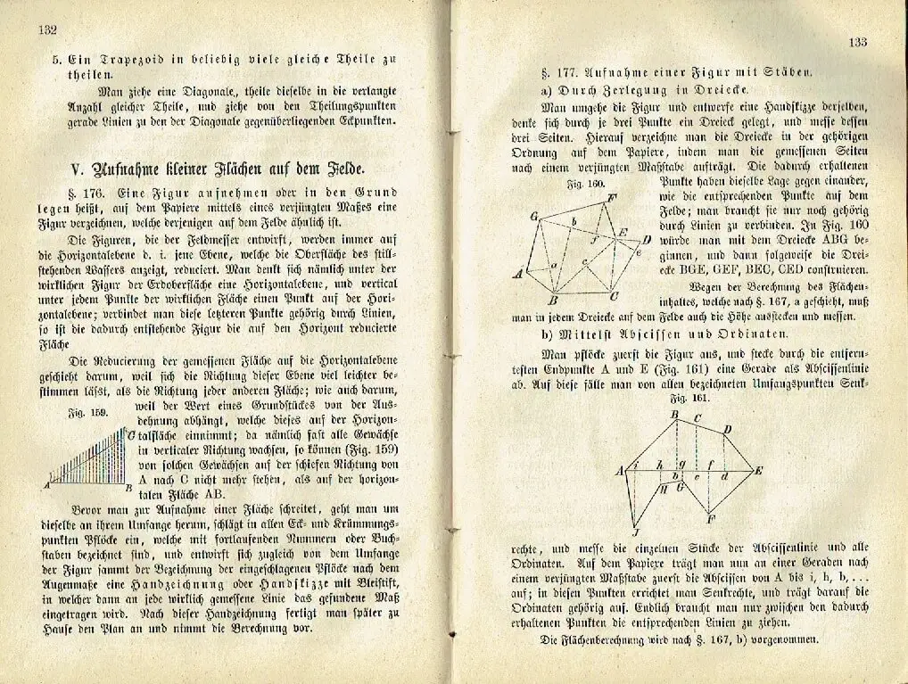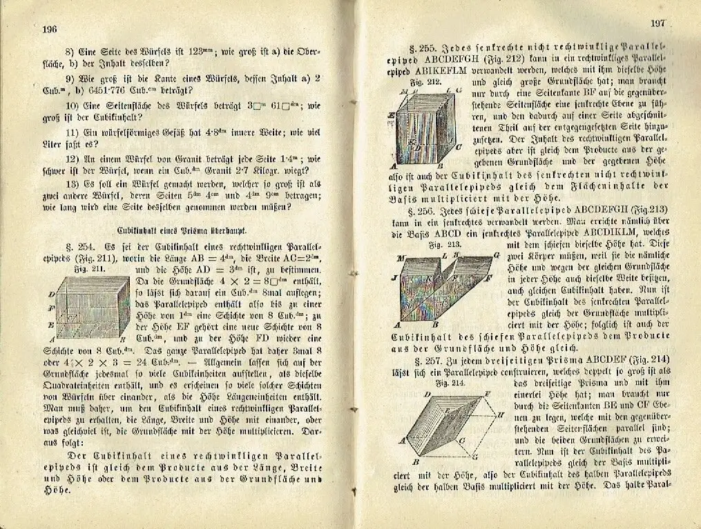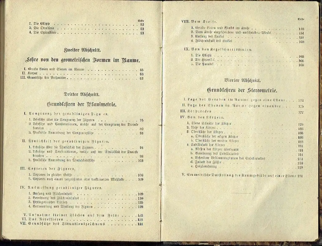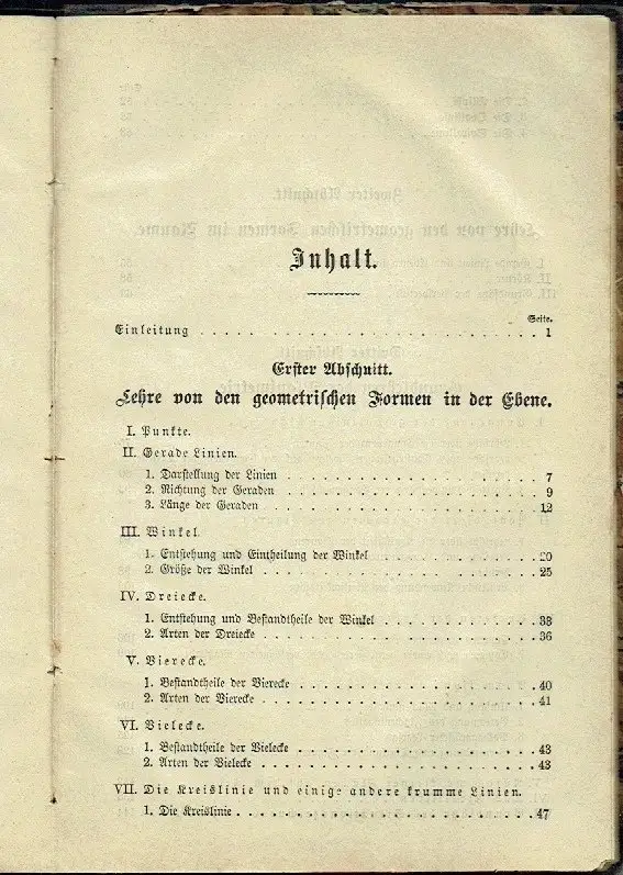 mittlerer bis noch guter Zustand, Gebrauchs- und Alterungsspuren: Einband etwas beschabt und abgenutzt - Rückseite senkrecht angebrochen - hinterer Vorsatz mit privaten Bleistiftnotizen - Papier teils etwas vergilbt, aber Seiten überwiegend sauber und ordentlich - Seiten teils etwas eselsohrig bzw. unten mit minimalem Eckabriss - Titel mit altem Besitzerstempel, Lehre von den geometrischen Formen in der Ebene und im Raume - Grundlehren der Planimetrie - Grundlehren der Stereometrie, Halbleinen, ca. 13,5 x 20,5, 230 Seiten mit 226 Bildern