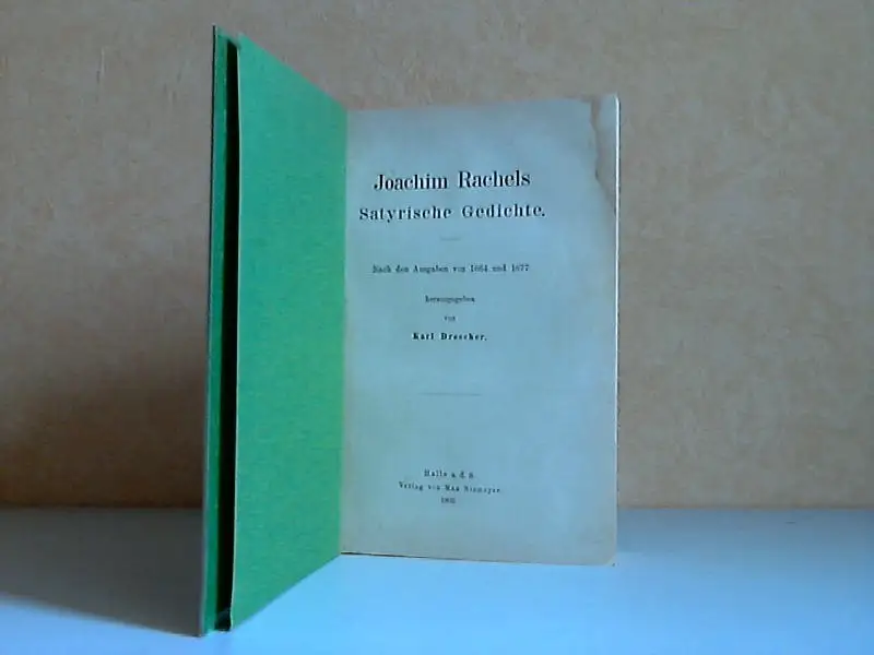 das Bild ist von der ersten Seite, Eigentumsaufkleber, das Buch ist ein Dachbodenfund, gebräunt, fleckig, das Buch wurde wahrscheinlich neu eingebunden, .... Das Interesse an dem Begründer der kunstmässigen, gelehrten, hochdeutschen Satire ist seit dem vorigen Jahrzehnt in erfreulicher Zunahme begriffen. Freilich, ganz war Rachel nie vergessen; in Compendien, Litteraturgeschichten, litterar-historischen Vorträgen fand er fast immer seinen Platz oder sein Plätzchen; aber es war in der zweiten Hälfte des achtzehnten und neunzehnten Jahrhunderts mehrfach doch nur in grösseren Zwischenräumen, dafs man seiner gedachte, oder dafs etwa noch eine neue Ausgabe seiner Gedichte erschien, und 38 beruhte das Gedenken nicht auf eigener Anschauung und eigenem Urteil, sondern Einer schrieb dem Andern nach. So waren Irrtümer nun unausbleiblich, sie mehrten sich, und wir sehen schliesslich nicht sowohl von Rachels äufserem Leben als vielmehr von der äusseren Geschichte seiner Dichtungen ein so verwirrtes und falsches Bild entstehen, wie es Goedeke Grundrifs ² III, 237 bietet. Zweck dieses Vorwortes soll sein, hier einigermalsen Klarheit zu schaffen. ... (aus dem Buch) Beschreibung vom Antiquariat Ardelt 3j6a Antiquariat Ardelt