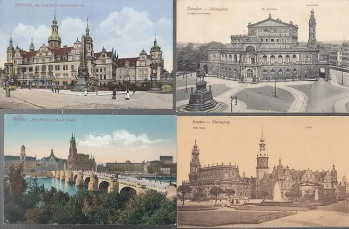 Dresden. - Ansichtskarten: Dresden. Konvolut mit 15 Ansichtskarten. 1) Theaterplatz mit Opernhaus und Fernheizwerk. 2) Theaterplatz mit Kath. Kirche und Schloß. 3) Kgl. Schloss. 4) Schloß und Wettin-Obelisk. 5) Neu Friedrich-August-Brücke / 6) Postplatz u