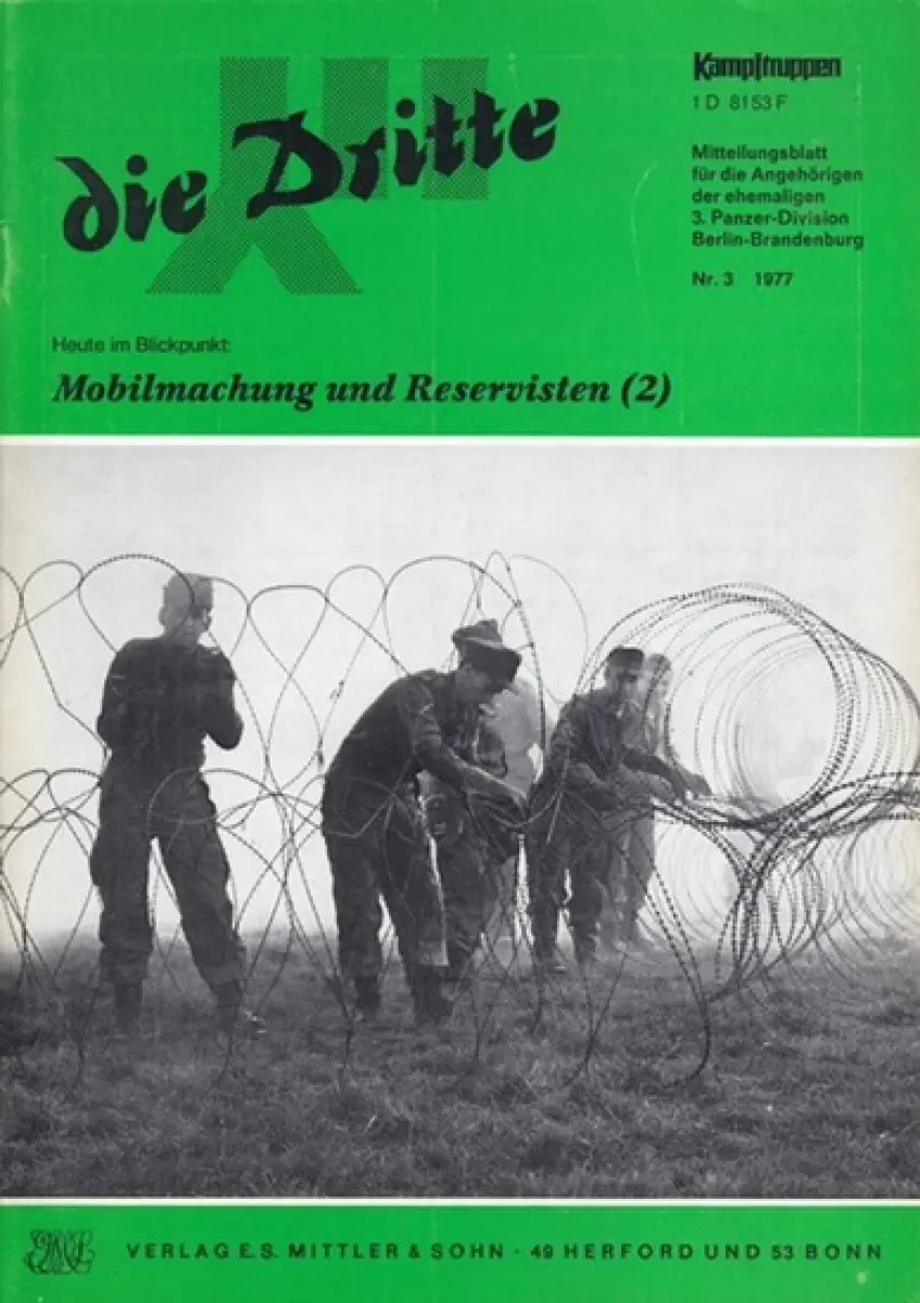 Titel: die Dritte. Jahrgang 26, 1977, Nr. 3. Mitteilungsblatt für die Angehörigen der ehemaligen 3. Panzer-Division Berlin-Brandenburg. Mobilmachung und Reservisten (2)