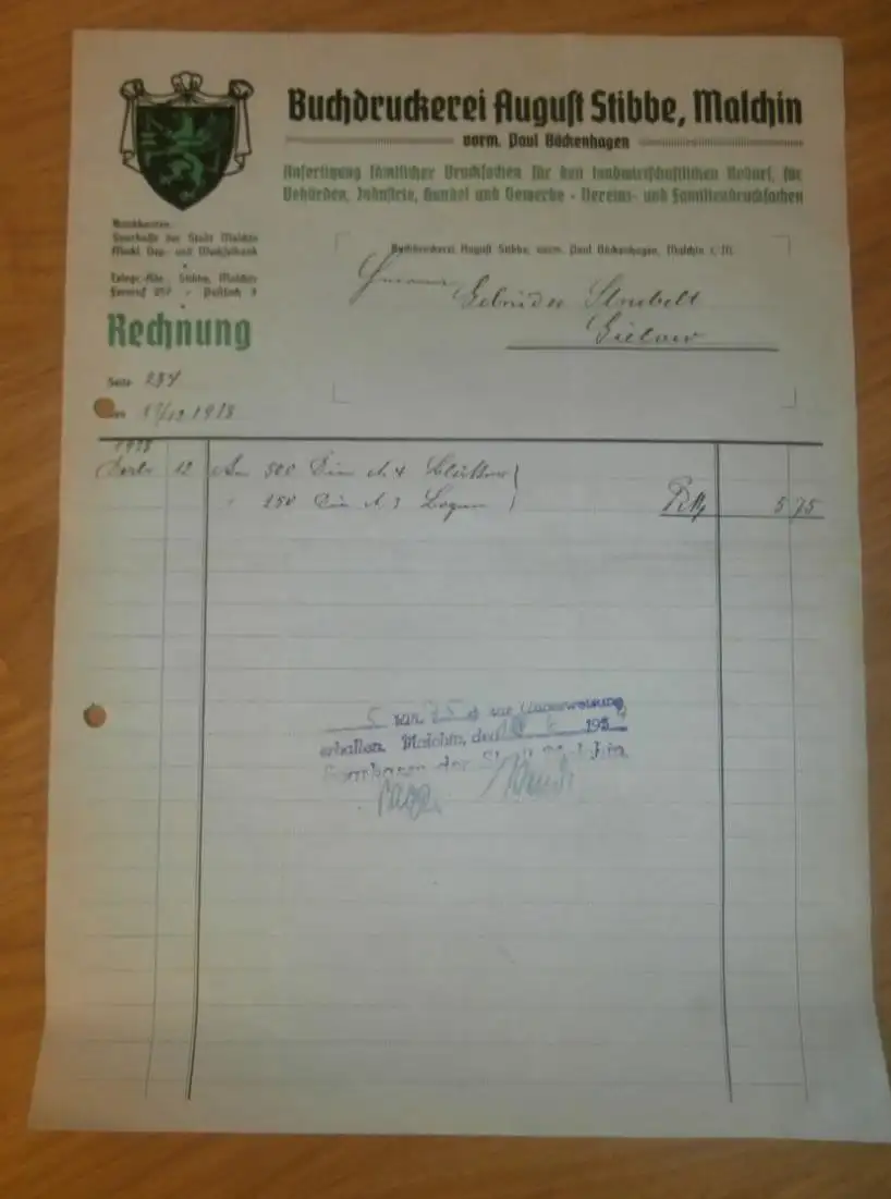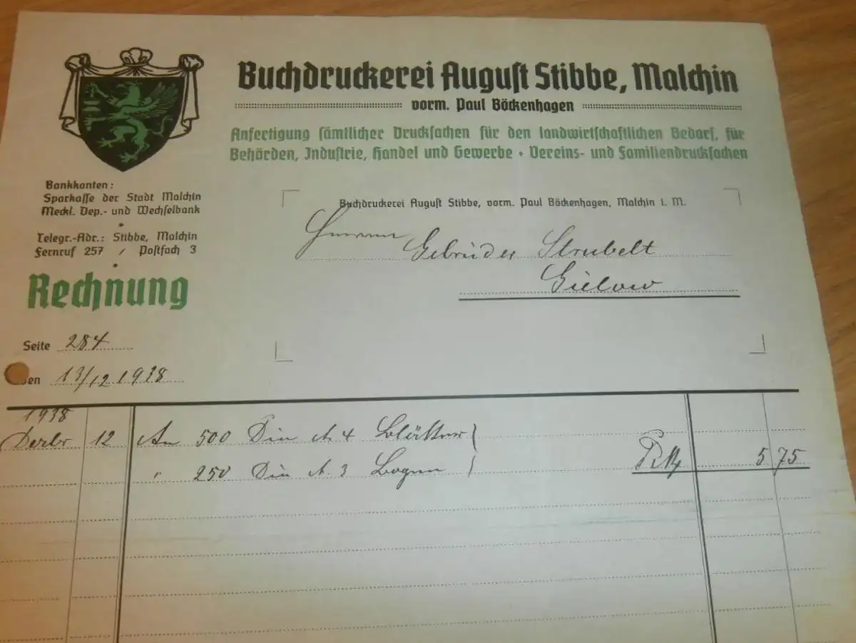 Druckerei August Stibbe in Malchin i. Mecklenburg , 1938 , Paul Böckenhagen , alte Rechnung !!!