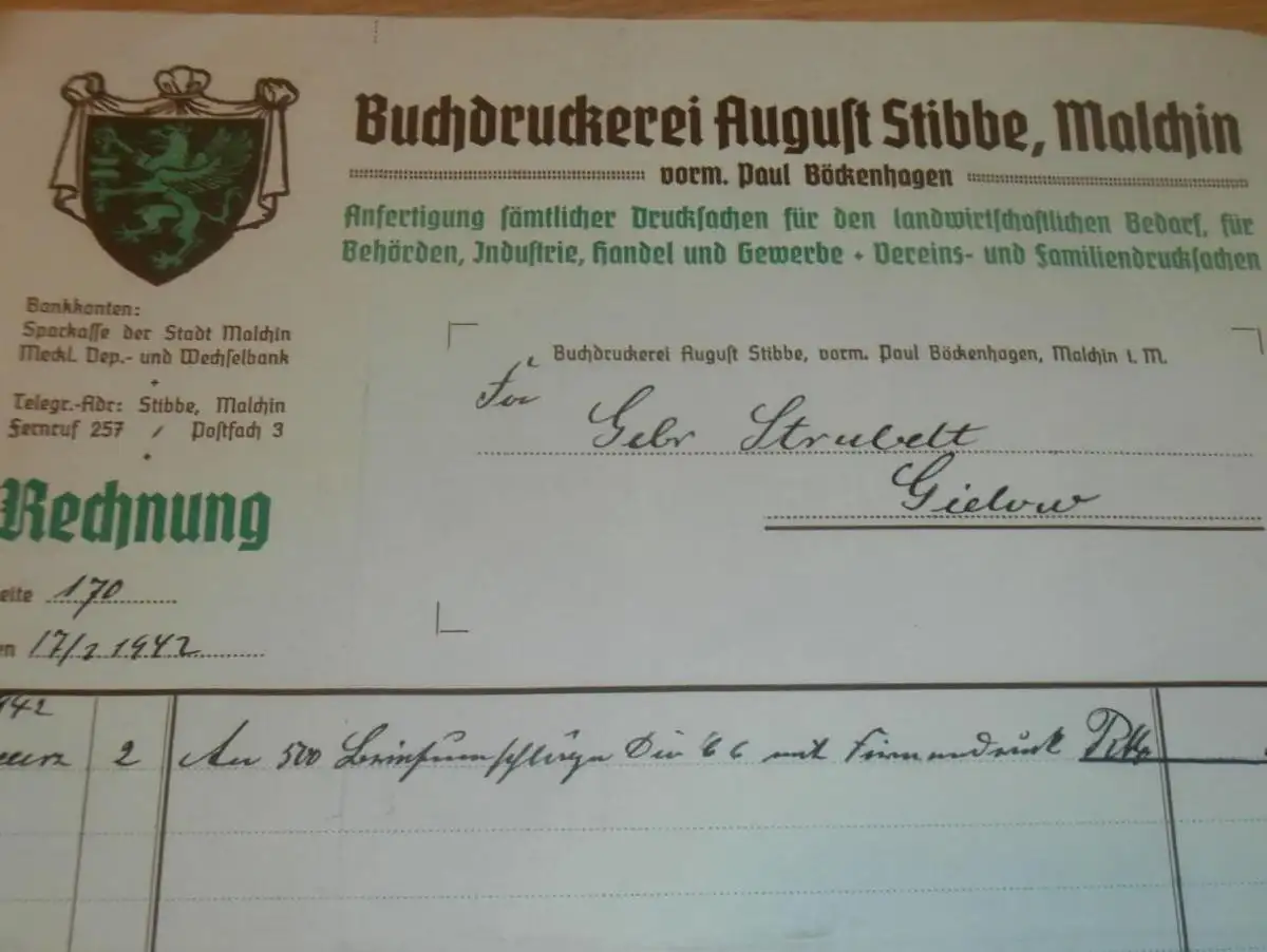 Druckerei August Stibbe in Malchin i. Mecklenburg , 1942 , Gielow , alte Rechnung !!!