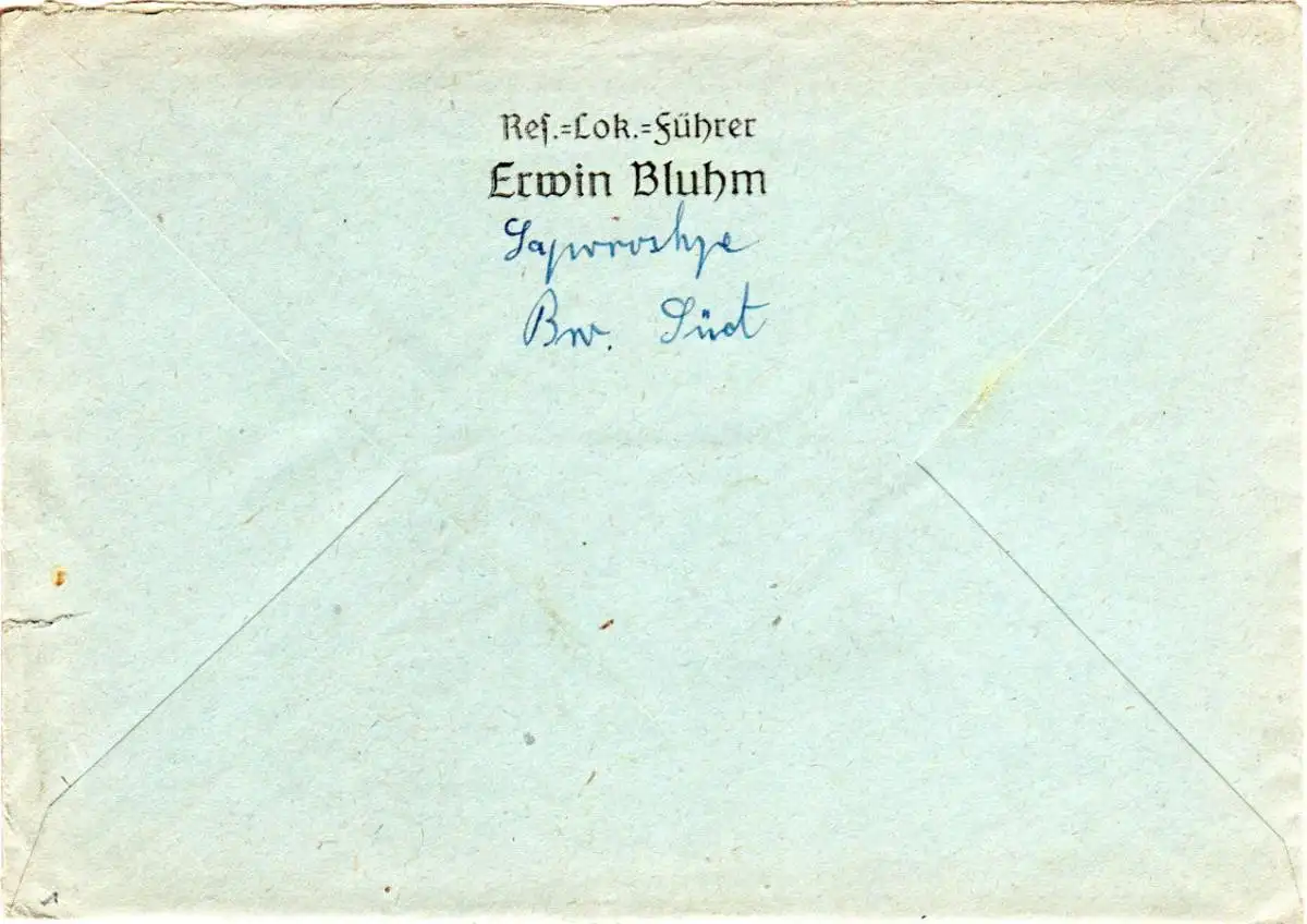 Briefstpl. EISENBAHNBETRIEBSDIREKTION SAPOROSHJE. Nach Glückstadt in Holstein gelaufener Brief m. kpl. Inhalt u. rücks. Absenderdruck Res.-Lok.-Führer Erwin Bluhm